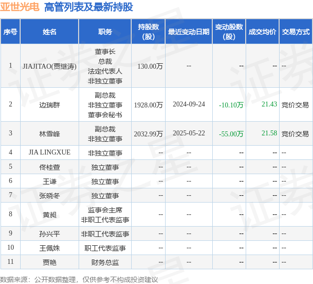 亚世光电的高管列表及最新持股情况如下:
